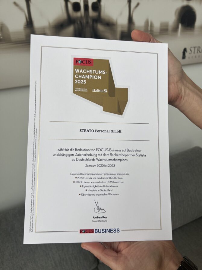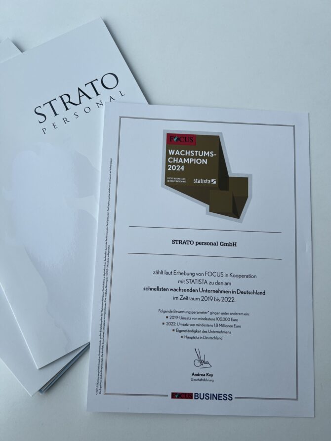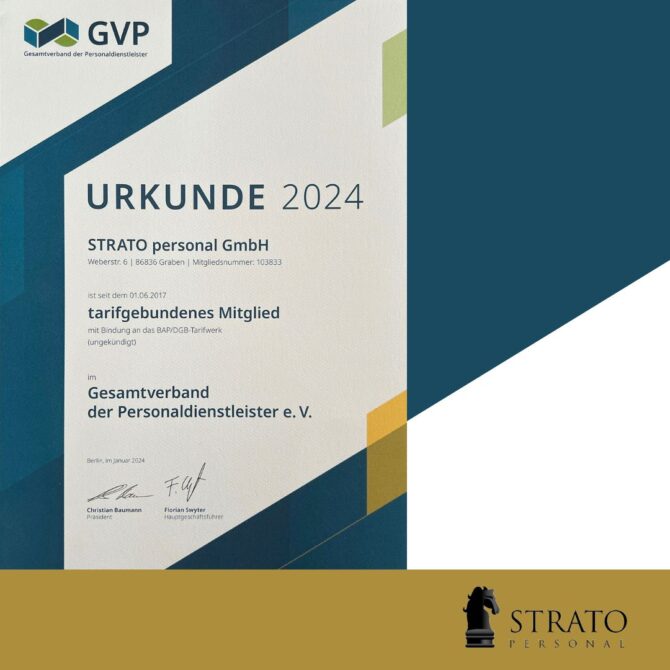 STRATO personal GmbH erhält auch für das Jahr 2024 die Urkunde des tarifgebundenen Mitglied im Gesamtverband der Personaldienstleister e. V.