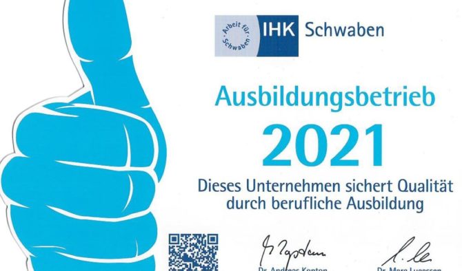 Auch 2021 sichern wir Qualität durch Ausbildung und werden dafür von der IHK Schwaben ausgezeichnet…